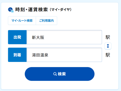 今回は、出発に「新大阪」、到着に「湯田温泉」を入力します。