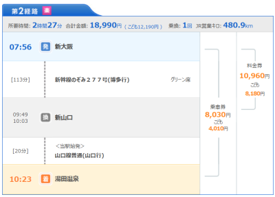 JR西日本株主優待券で「新大阪-新山口」間はどのくらい安くなるの?