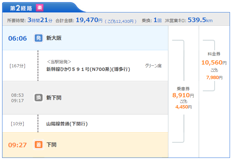 新大阪駅から下関駅の新幹線(グリーン車)+在来線切符を購入 9630円 × 2枚 = 19260円